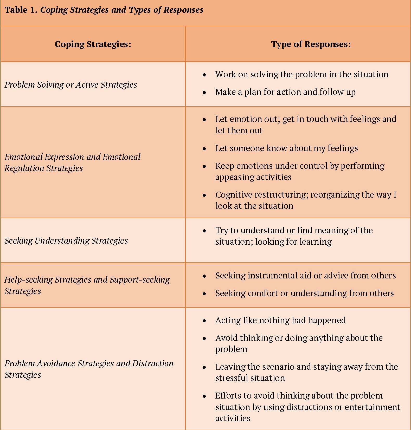 Table 1 below presents a list of coping strategies and is a summary of strategies reported in Clarke, 2006; Skinner, et al., 2003; Folkman & Moskowitz, 2005. Although completed lists are more extensive, this table presents styles reported across the three studies that presented similar types of responses.